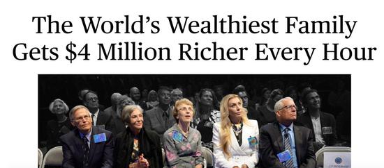 排名首位、控股沃尔玛的沃尔顿家族(Waltons)资产为1905亿美元。这一家族过去一年的资产增长速度是这样的:每分钟上涨7万美元、每小时上涨400万美元、每天上涨1亿美元……而沃尔玛初级员工的时薪大约仅为11美元;