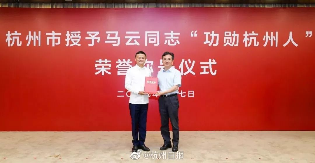 9月7日下午,市委、市政府举行授予阿里巴巴集团董事局主席马云“功勋杭州人”荣誉称号仪式。省委常委、市委书记周江勇讲话,并为马云授证书和印章。于跃敏等市四套班子领导出席。