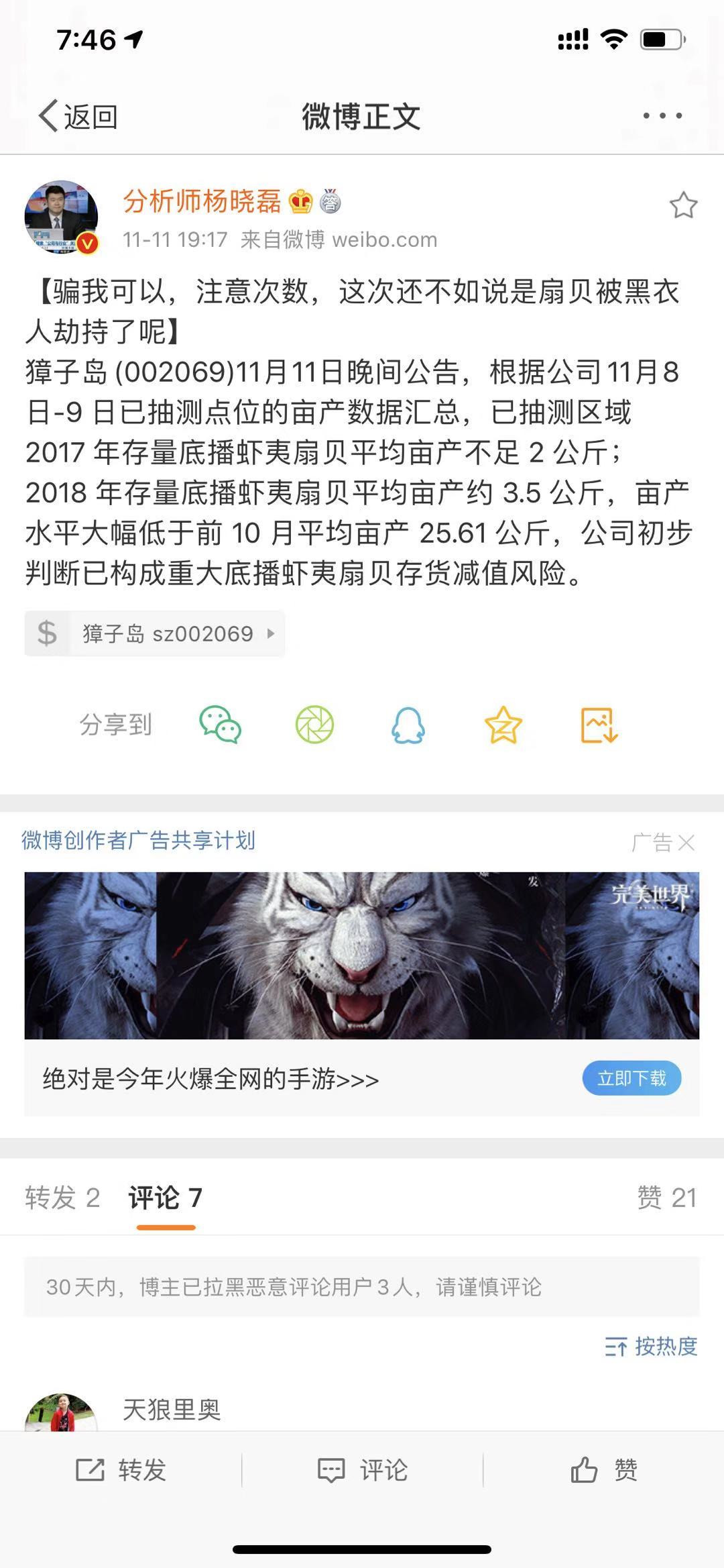 11日晚间,上市公司獐子岛发公告称,根据公司11月8日-9 日已抽测点位的亩产数据汇总,已抽测区 域 2017 年存量底播虾夷扇贝平均亩产不足 2 公斤;2018 年存量底播虾夷扇贝平均亩产约3.5公斤,亩产水平大幅低于前10 月平均亩产 25.61 公斤,公司初步判断已构成重大底播虾夷扇贝存货减值风险。
